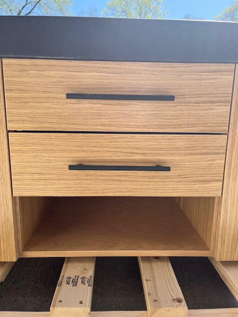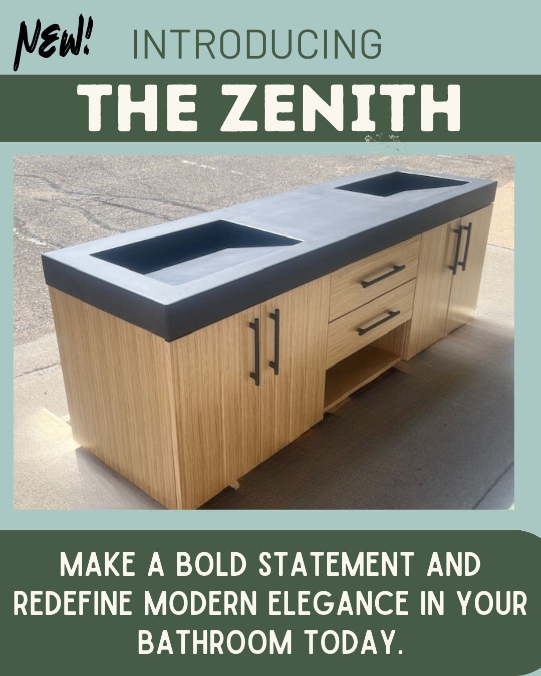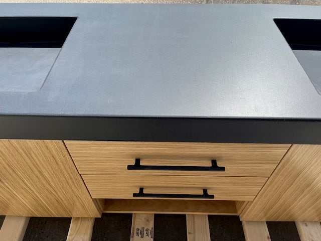 The Zenith Double Vanity Cabinet & Top! The set includes the Beautiful Oak Cabinet and the Concrete Vanity Top with 2 sinks.