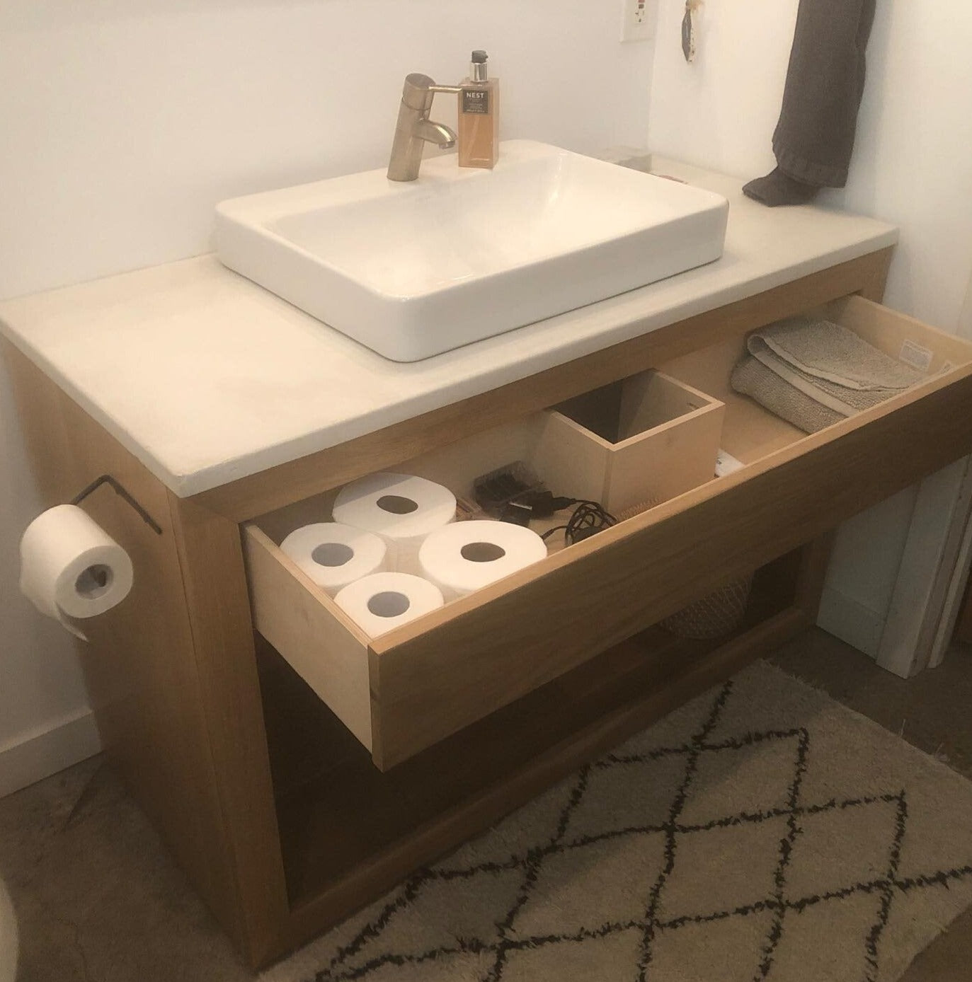 Get started with your Bathroom update! Our Hiawatha Single Vanity Cabinet with one drawer and an open shelf will add the storage you have needed. The Concrete Counter Top can be customized with your color preference and sink style.The solid concrete slab top for setting a sink on is available in your choice of color and is ready for you to add a vessel sink of your choice. The Vanity cabinet measures 48" wide x 22" front to back. Sink is sold separately.